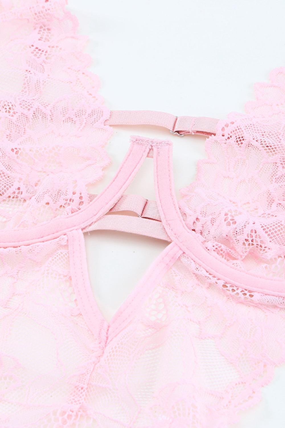 Body rosa de encaje con escote en V ajustado de varilla con tirantes ajustables .